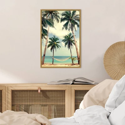 ART DESCRIPTION: In this sunny tropical scene, palm trees reach high into the sky. A net hammock is hung between them, inviting relaxation. Look again and you will see that the hammock forms a smile, while the two shorter palms form the eyes. This Amanti Art canvas art print was created by Design Fabrikken and printed by Amanti Art in Madison WI. The canvas is stretched by hand and finished with a float frame. Individually made using traditional custom framing techniques, it has the quality you would expect from your local frame shop. Because of our attention to detail and focus on artistry, architects, interior designers, and homeowners alike choose this framed canvas artwork to create beautiful living spaces.