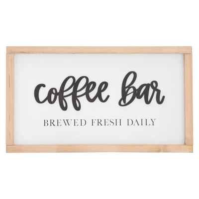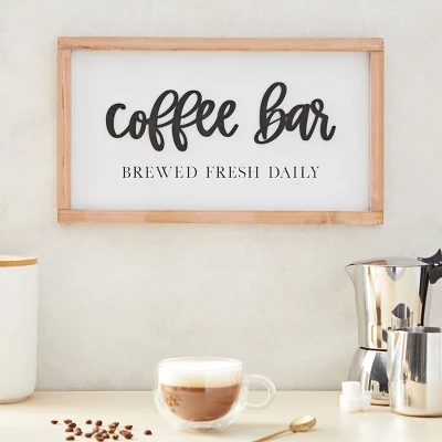 Create one-of-a-kind wall decor in your kitchen, bakery, or coffee shop with this wood sign that features black lettering that reads “Coffee Bar” in large text and “Brewed Fresh Daily” in smaller text. The rectangular kitchen coffee decor sign is made from high-quality wood. Use the sign as coffee accessories in your home, or gift the coffee signs for coffee bar countertop decor to a loved one at a baby shower, anniversary or gift exchange. The decorative text will effortlessly elevate your coffee station or coffee corner decor